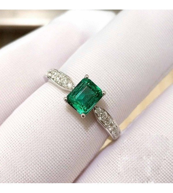0.81 Cts Green Emerald Octagon Shape Gemstone From Zambia 0.185 Cts Diamond Ring in 18k Gold Jewelry Gross Wt. 2.36 Gms