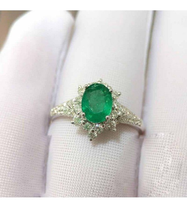 0.71 Cts Green Emerald Oval Shape Gemstone From Zambia 0.358 Cts Diamond Ring in 18k Gold Jewelry Gross Wt. 2.83 Gms