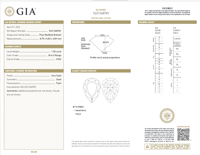 gemstone Diamond shape Pear carat 1.5 Color W-X Clarity VVS2 Symmetry G Certificate GIA
