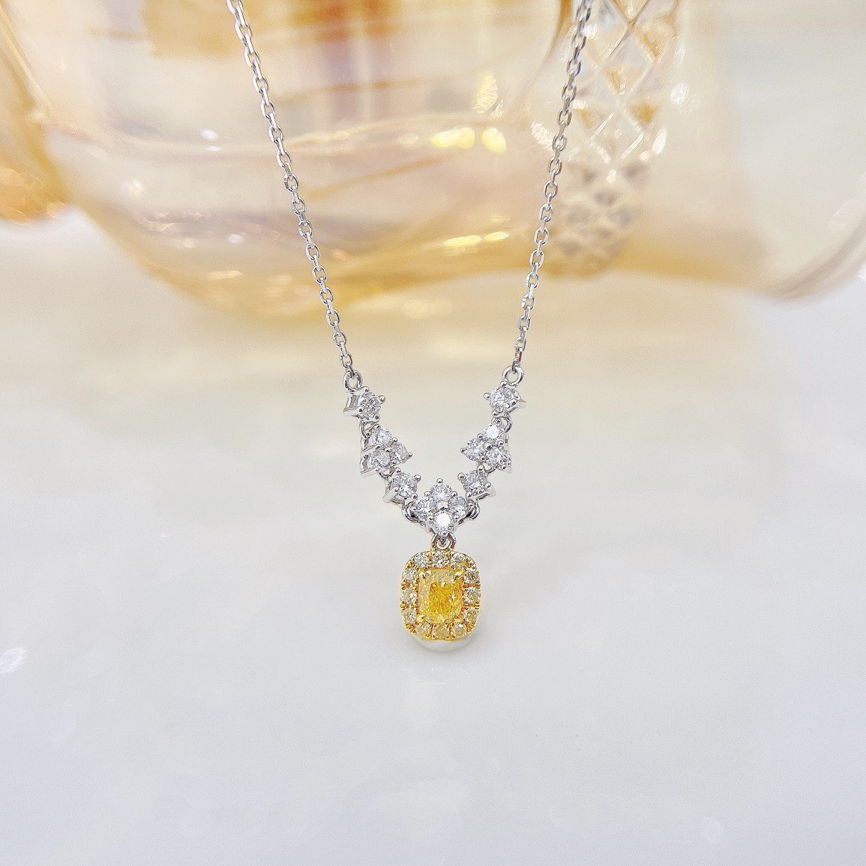 0.16 Cts Fancy Yellow Diamond Cushion Shape Gemstone 0.28 Cts Diamond Necklace in 18k Gold Jewelry Gross Wt. 1.96 Gms