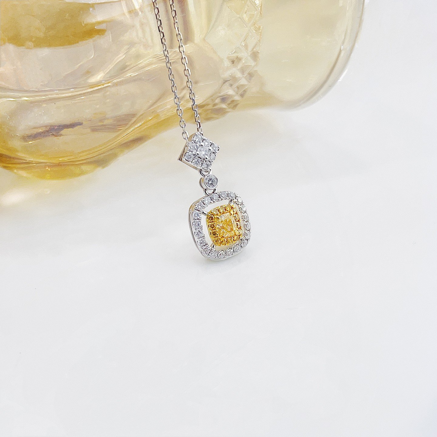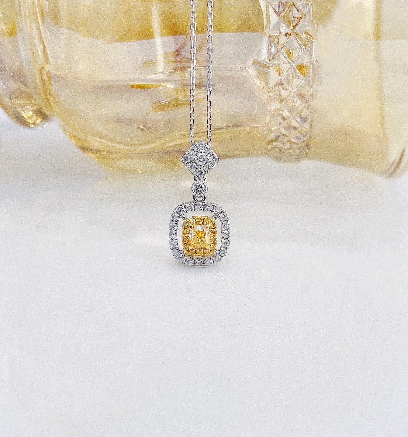 0.20 Cts Fancy Yellow Diamond Cushion Shape Gemstone 0.31 Cts Diamond Necklace in 18k Gold Jewelry Gross Wt. 2.52 Gms