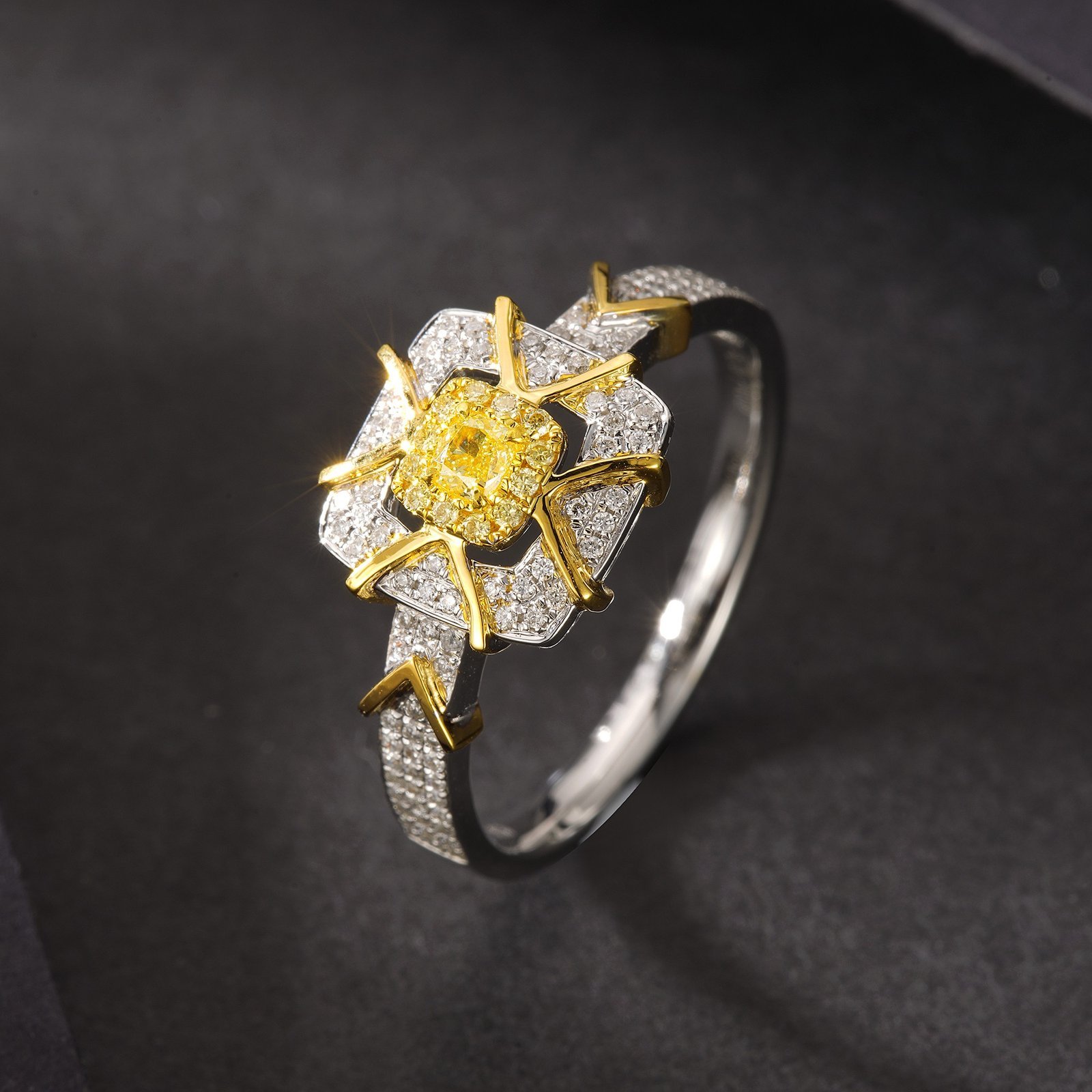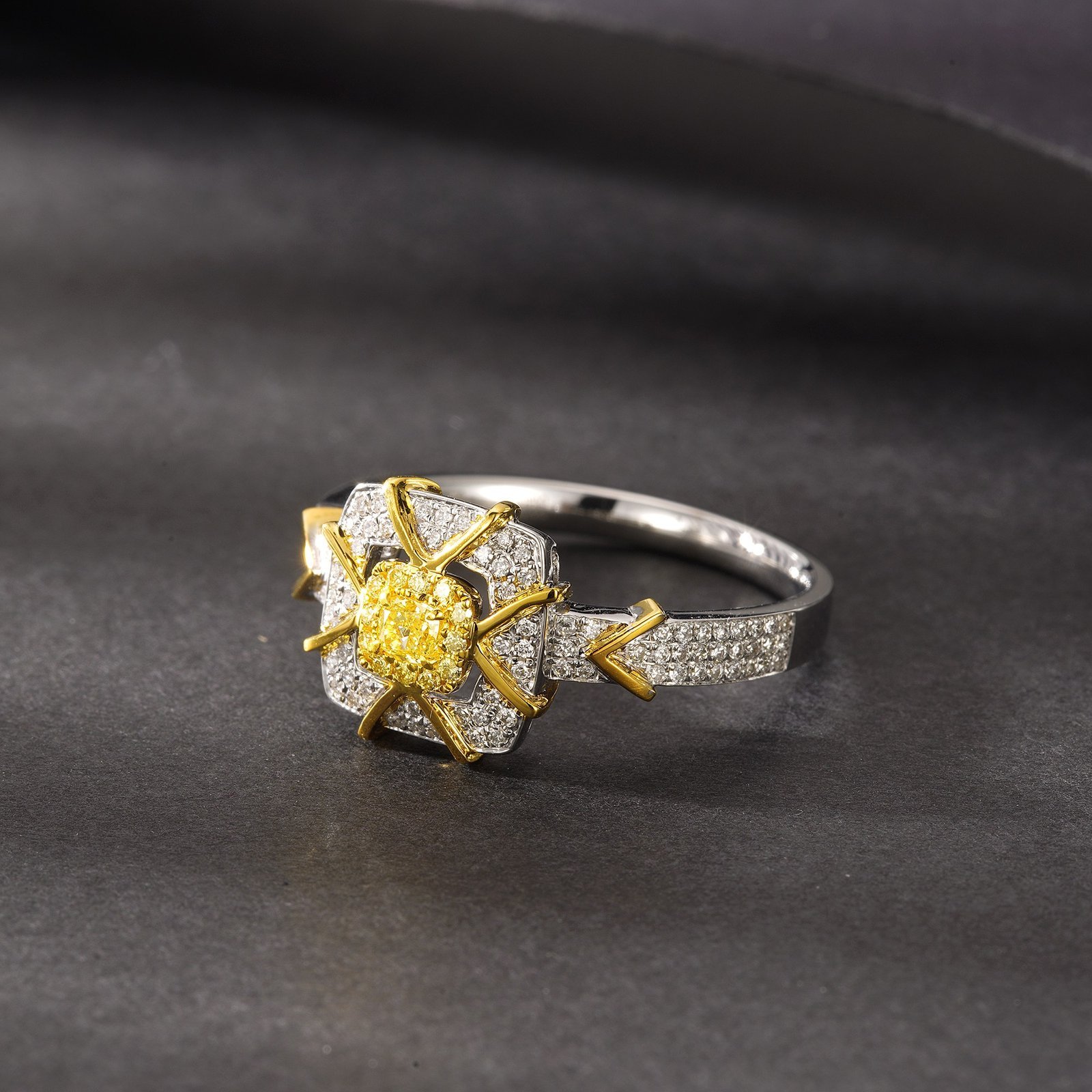 0.09 Cts Fancy Yellow Diamond Cushion Shape Gemstone 0.22 Cts Diamond Ring in 18k Gold Jewelry Gross Wt. 3.29 Gms