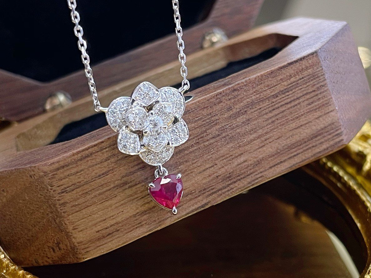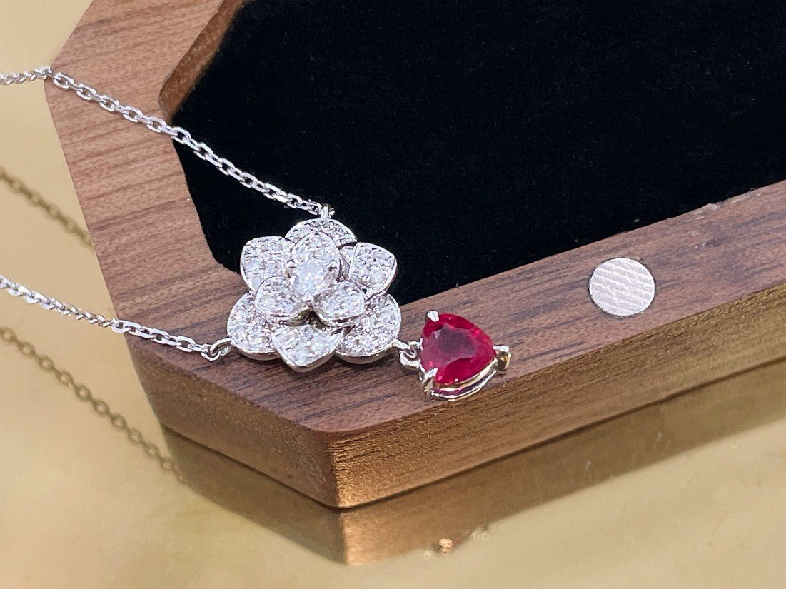 0.42 Cts Vivid Red Ruby Heart Shape Gemstone 0.24 Cts Diamond Necklace in 18k Gold Jewelry Gross Wt. 3.42 Gms